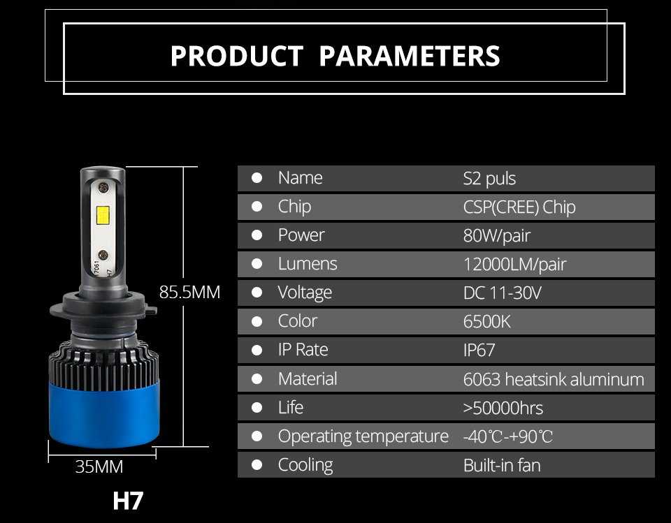 Основные характеристики светодиодных ламп h7 (3800 Люменов):