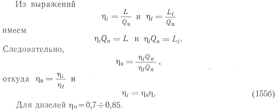 Для оценки степени использования тепла в двигателе по сравнению с использованием тепла в термодинамическом цикле, т. е. для оценки тепловых потерь цикла в реальном ДВС по сравнению с соответствующим идеальным ДВС вводится понятие относительного к. п. д. ? , представляющего отношение количества тепла, превращенного в индикаторную работу L i , к тому количеству тепла, которое могло бы быть превращено в работу L при идеальных условиях протекания цикла, ? = L i L .