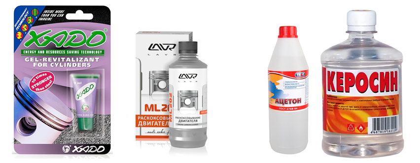В продаже имеются десятки специализированных средств для выполнения раскоксовки двигателя. Наиболее известными можно назвать ЛАВР и ХАДО, которые приобрели свою популярность за счет низкой цены и хороших свойств. Их состав чуть сложнее, чем просто смешанные ацетон и керосин, но и стоимость таких средств подобающая.