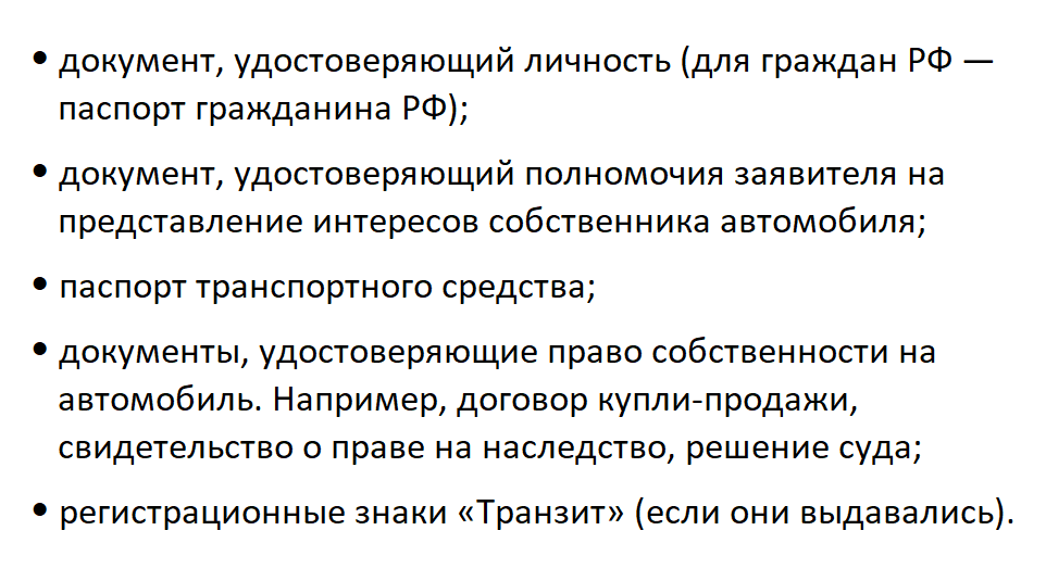 Шаг 1. Подготовка документов. Вне зависимости от того, направляется ли автовладелец в МФЦ, посещает сайт Госуслуг или сразу идет в ГИБДД, от него потребуется стандартный набор документов, подкрепленный заявлением на регистрацию транспортного средства. Список документов можно увидеть на изображении ниже.