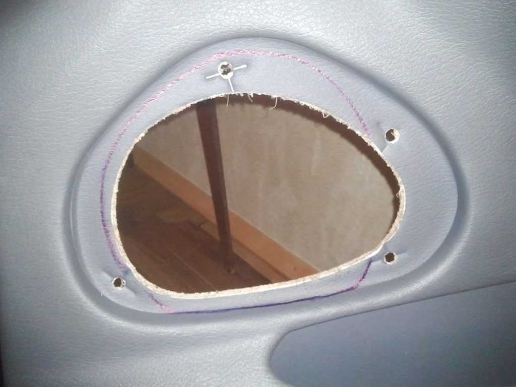 Подиум готов. Теперь его надо установить в дверцу автомобиля. Обычно он крепится саморезами, которые вкручиваются с обратной стороны обшивки: