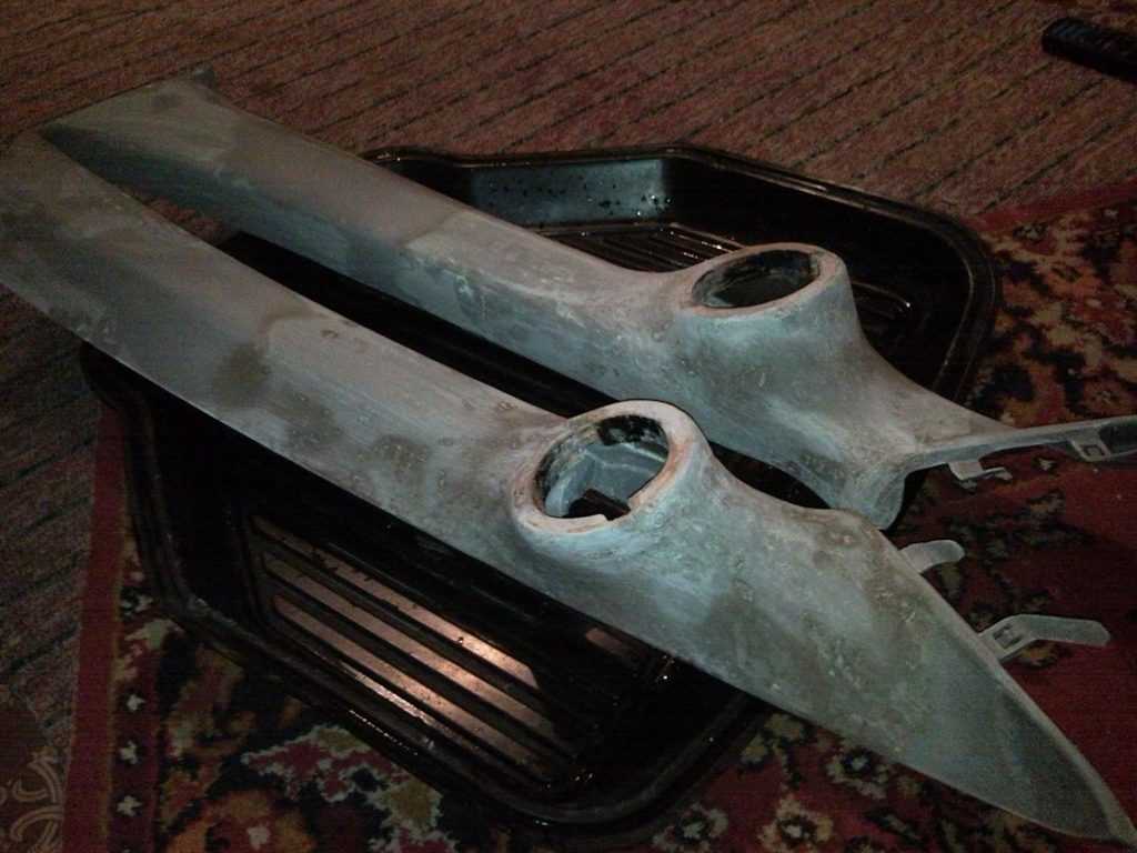 Эпоксидный клей высох. Убираем скобки, отрезаем лишнюю ткань. Теперь берем наждачку, зашлифовываем всю деталь (матуем), обезжириваем и начинаем выравнивать поверхность подиума шпаклевкой. Когда форма уже готова, не забываем обезжирить и начинаем грунтовать подиум. Грунтовка высохла, если все нормально, то обезжириваем, и наконец, красим.