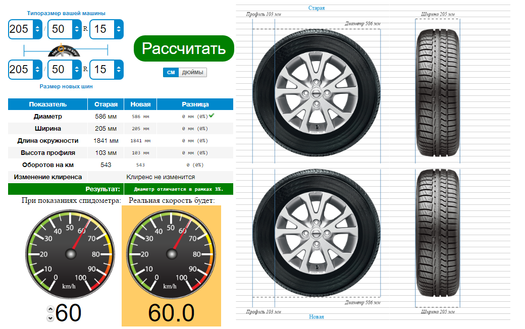 Пользоваться виртуальным шинным калькулятором очень просто. В левом верхнем углу приложения находятся выпадающие поля. В верхнем ряду вам необходимо выбрать типоразмер вашей оригинальной заводской шины (или просто тех шин, которые стоят на вашей машине в данный момент). Эти показатели вы можете просто посмотреть на профиле шины (боковой поверхности). Первое поле — это ширина шины в милиметрах. Второе поле — это отношение высоты профиля к ширине шины в процентах. Третье поле — это диаметр диска в дюймах.
