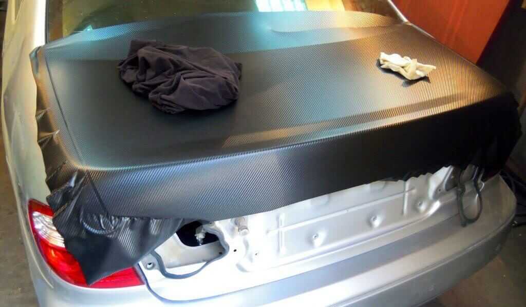 Карбоновая пленка клеится на чистую, обезжиренную поверхность. Материал крепится на поверхность малярным скотчем или магнитами, после чего вырезается заготовка нужных размеров. Рекомендуется оставить по 3–5 см запаса. Снимая защитное покрытие, необходимо медленно и аккуратно приклеивать материал, начиная от центра и двигаясь к краям. Все работы выполняются с помощью ракеля. В борьбе с пузырями и неровностями поможет теплый воздух. Края подгибаются под бампер и фиксируются термоустойчивым клеем.