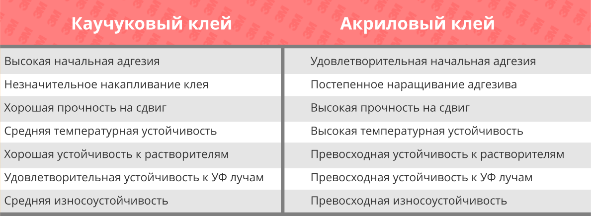 В технологии 3M используются клеевые составы на основе акрила и каучука. Ниже приведены характеристики данных адгезивов, которые помогут с выбором.