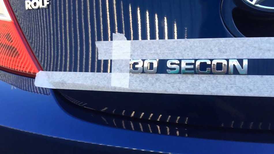 Ленту убирают, после чего можно заниматься удалением эмблемы и малярными работами. Полученные отметки позволят приклеить шильдик на авто на нужное место. Достаточно вернуть малярную ленту и соотнести с маркерными линиями на ней.