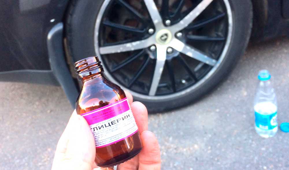 Еще один известный способ придания черноты шинам заключается в нанесении глицериновой смеси. Глицерин продается в аптеке и стоит всего 15-20 рублей. Вещество прекрасно растворяется в воде, образуя однородную смесь. Разведите глицерин с водой в пропорции 1:1. Полученный раствор капните на губку и обработайте резину. Покрытие получится немного матовым. Чтобы появился глянец, глицерина нужно брать в два раза больше, например, на 100 мл воды 150 мл вещества. Однако, чем больше глицерина вы нанесете на шины, тем быстрее они загрязнятся. К колесам будет прилипать пыль, грязь, мусор, поэтому не переусердствуйте.