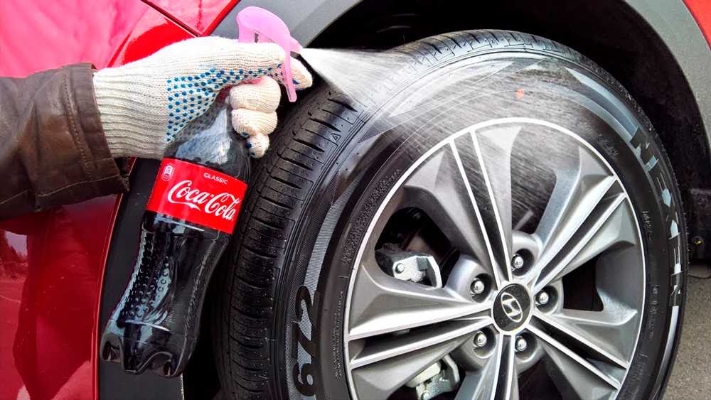 Для чернения колёс можно воспользоваться чистящим средством и обычной колой. Возьмите Мистер Мускул для стёкол (или любое другое аналогичное средство), и тщательно натрите им резину. После этого нанесите Кока-Колу на мягкую губку и несколько раз вотрите напиток в колесо.