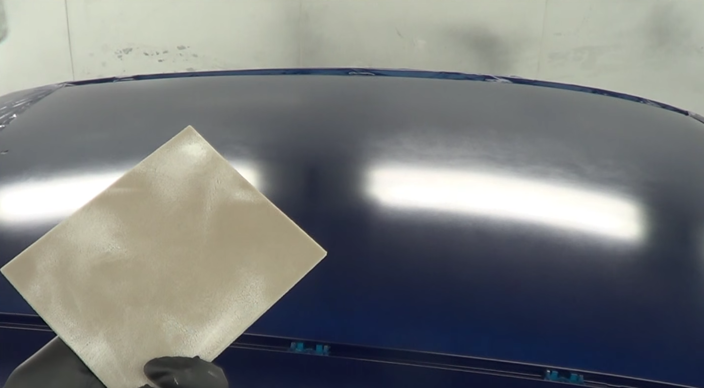 Третье – это матирование поверхности крыши. Нужно это в первую очередь чтобы снять слой лака и обеспечить условия лучшей адгезии наносимой краски с корпусом крыши. Добиваются такого эффекта, используя скотч-брайт или же пасты для матирования поверхности с различными абразивами. Если таких материалов под рукой нет, то можно использовать обычную наждачную бумагу с мелким зерном, например Р1000-1200.