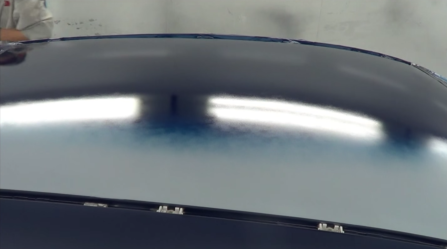 Покраска крыши авто осуществляется непрерывным нанесением продольных линий краски с одного края поверхности в другой. Задерживать движение нельзя, поскольку образуются неравномерные по толщине слои покрытия.