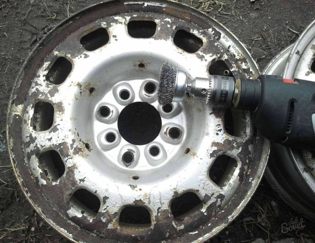 Для начала автодиск следует отмыть от грязи и высушить. Затем можно приступать к обработке и снятию старого слоя краски. Но такая работа может занять не один день, поэтому если рабочая поверхность не сильно поддалась коррозии, то всю краску можно не снимать. Достаточно пройтись дрелью с насадкой и убрать мелкую ржавчину.