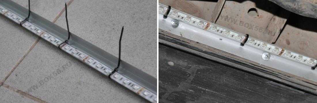 При организации подсветки кузова, клей вряд ли поможет. На днище, под порогами для крепления лучше использовать профиль с пластиковыми хомутиками.