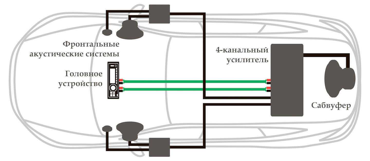 Схема с 4-канальным усилителем, работающим на фронтальную акустику и сабвуфер, по праву считается классикой автомобильных аудиосистем