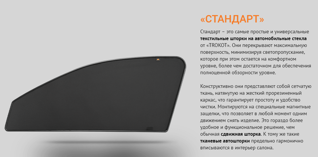 Автомобильные шторки на боковые стекла категории «Trokot Стандарт» закрывают две трети проема. Ткань шторы не закрывает наружные зеркала, гарантируя 100% обзорность без затемнения. Сегодня доступны солнцезащитные экраны для большинства существующих марок машин.