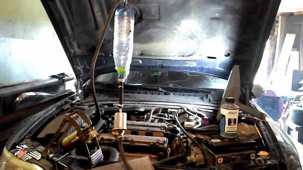 В днище и пробке бутылки необходимо проделать отверстия, подобрав диаметр сверла под размер вентилей. Затем в отверстие, сделанное в пробке, нужно врезать вентиль без золотника и присоединить к нему шланг хомутом. После шланг разрезается пополам и в разрыв ставится топливный фильтр с соблюдением направления потока (от бутылки). Во второе отверстие вставляется вентиль с золотником, куда подключается насос. Для удобства бутылку желательно подвесить к открытому капоту горлышком вниз. Приспособление готово.