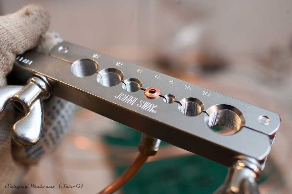 - Вместо конуса ставится штамп, соответствующий по сечению трубке (и отверстий в держателе, и штампов в приспособлении для развальцовки от 5 до 8, так что нужный размер подобрать несложно);