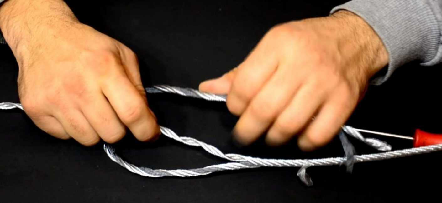 1. Концы обычного семипрядного троса ровно обрезаем болгаркой либо обрубаем молотком (его острой частью). 2. Расплетаем трос на 50-70 см и при помощи отвертки делим его на две части. В одной получается три пряди, а в другой — четыре. 3. Свиваем пряди обеих частей между собой. 4. Делаем петлю с диаметром не менее 10 см. 5. Сгибаем первую четырехпрядную часть навстречу другой, которую помещаем в изгибы основного троса. 6. Концы сплетенных нитей поочередно обкручиваем вокруг импровизированного черенка. 7. Затем каждую свободную прядь закручиваем поочередно вокруг черенка, вплетая в петлю, и повторяем процесс. 8. После этого, накладывая последующий на предыдущий, накрываем концы всех прядей. В итоге таких манипуляций получаем две нити, которые необходимо разместить с помощью отвертки между петельными. В этом месте лучше заделать кусочками трубок, расплющив их, либо применить изолирующую ленту. Это поможет в дальнейшем избежать травм.