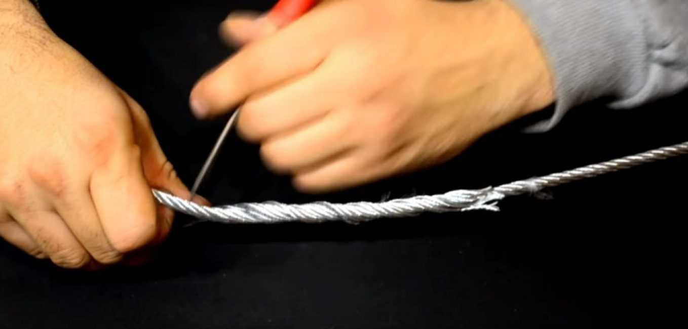 Трос необходимо расплести от его конца до сделанной отметки при помощи отвёртки. Сделать это достаточно просто. Обычно, трос состоит и 6 сплетённых нитей.