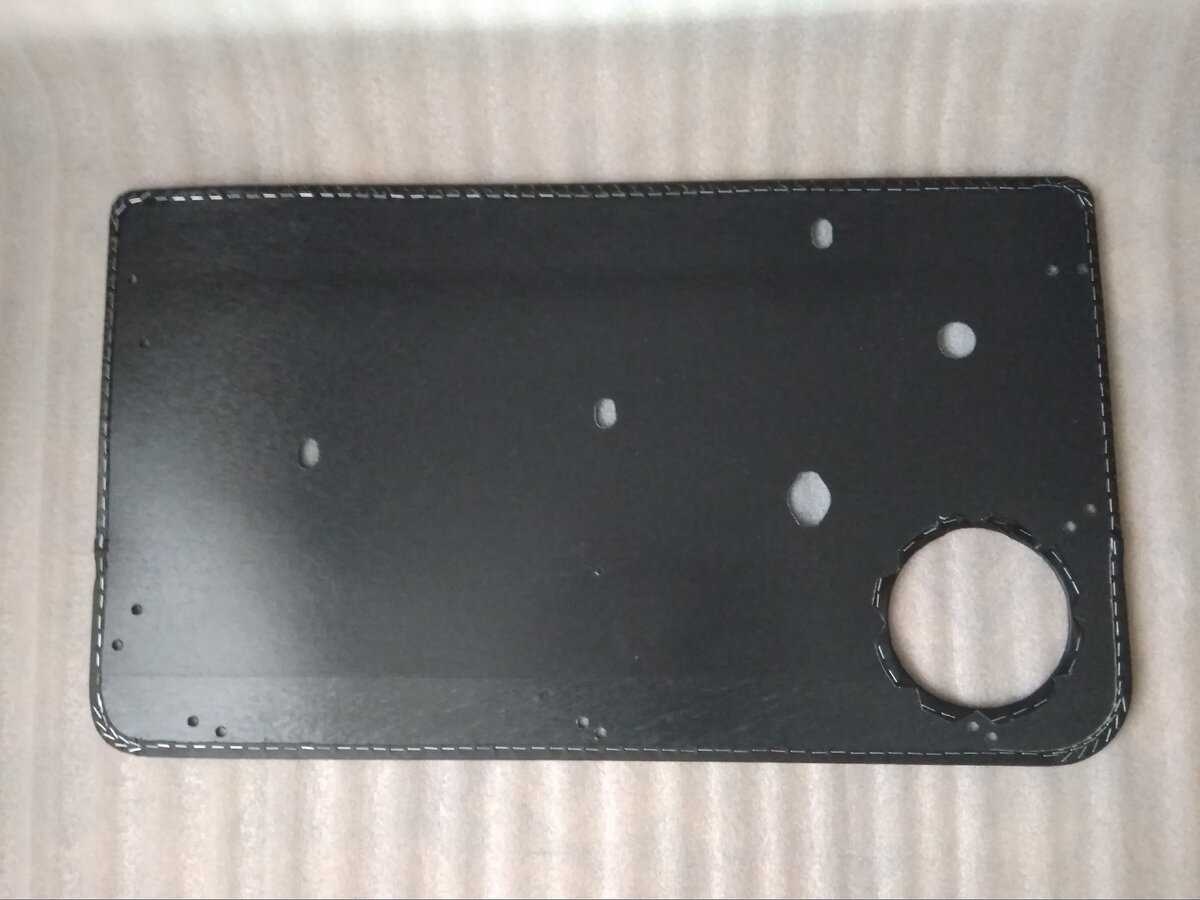 Обшить панель можно цельным или сшитым куском выбранного материала. Если обшивка состоит из двух или более кусков, необходимо проследить, чтобы отверстия не вырезались по линии машинной строчки. Обрезать выкройку необходимо, оставляя припуск по периметру до 5 см. Винил кожа, алькантара значительно деформируются при усадке. Ворс в текстильной обивке нельзя заворачивать, когда прорезаются отверстия под ручки.