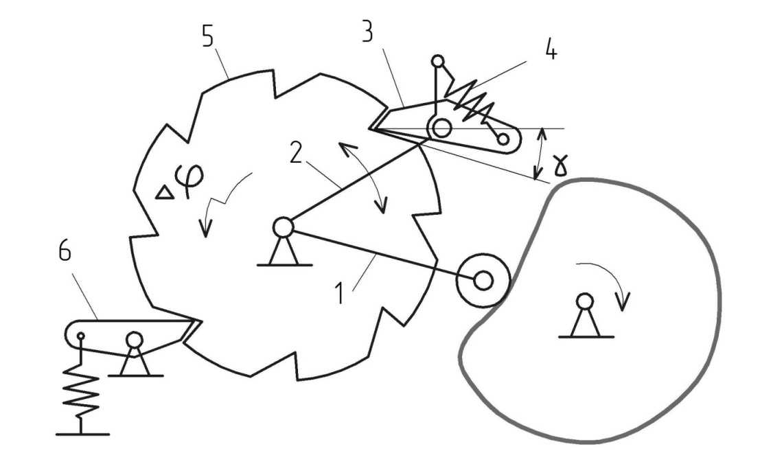 1 – толкатель; 2 – рычаг; 3, 6 – собачка; 4 – пружина; 5 – храповое колесо
