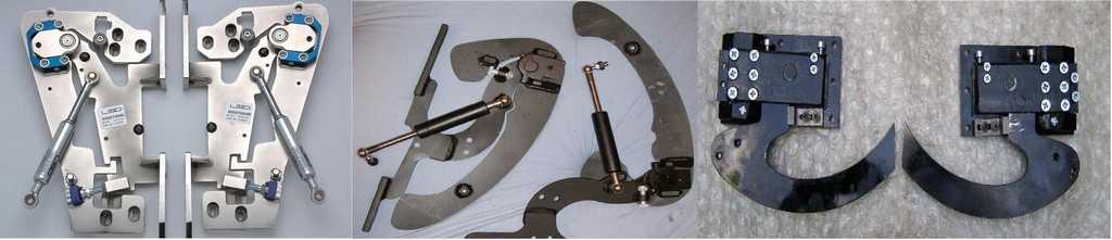 Далее идут петли, которые разработала фирма GT Factory. Не плохой набор. Он так называемый «универсальный». Его отличает большой угол открытия и два аммортизатора на каждую петлю. Из минусов: не на все машины подходит из-за того, что требует много места под установку. Еще опирание двери в данном случае идет в самой петле и при опускании двери вниз она раскачивается и приходится ловить положение двери, чтоб замОк на двери правильно оделся на петельку на стойке корпуса авто.