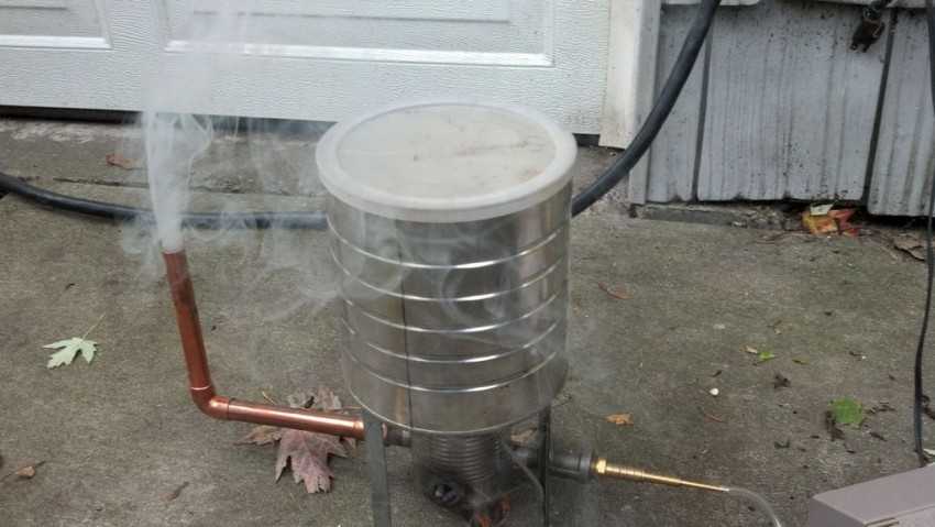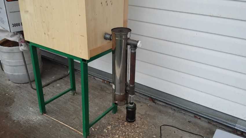 Если требуется установка большей производительности, варят простейшую печку. Ее можно сделать из той же трубы большого диаметра или сварить из металла прямоугольный корпус. Приварить дверку, сделать дымовую трубу, закрепленную под наклоном. Вот и все сложности. Нужно еще внутреннее пространство разделить горизонтально закрепленным металлическим листом на две части. Нижняя часть больше, верхняя — меньше. Внизу разжигают огонь, на лист насыпают опилки. Дальше процесс известен.