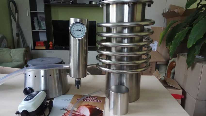 Если камера для продуктов невелика, с задачей справится даже аквариумный прибор. Когда коптильня большая, выбор падает на автомобильный компрессор или элемент холодильника.