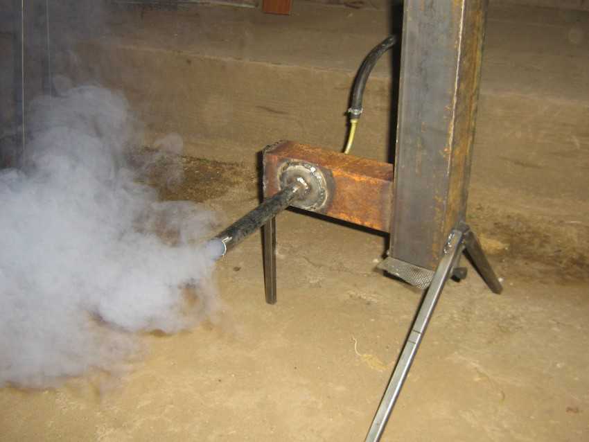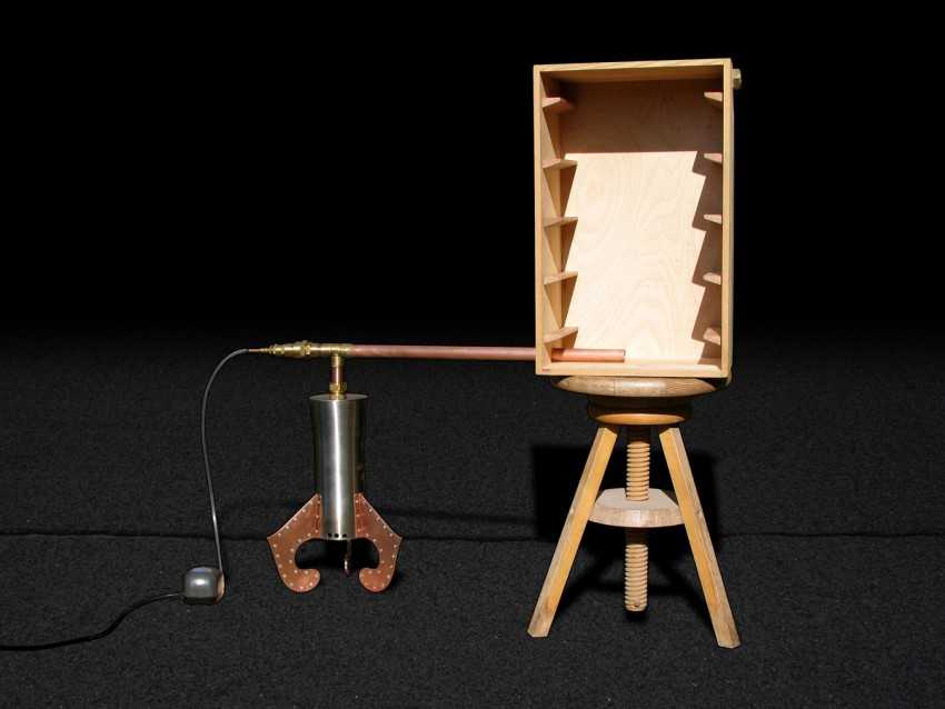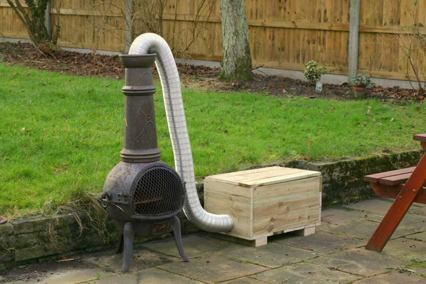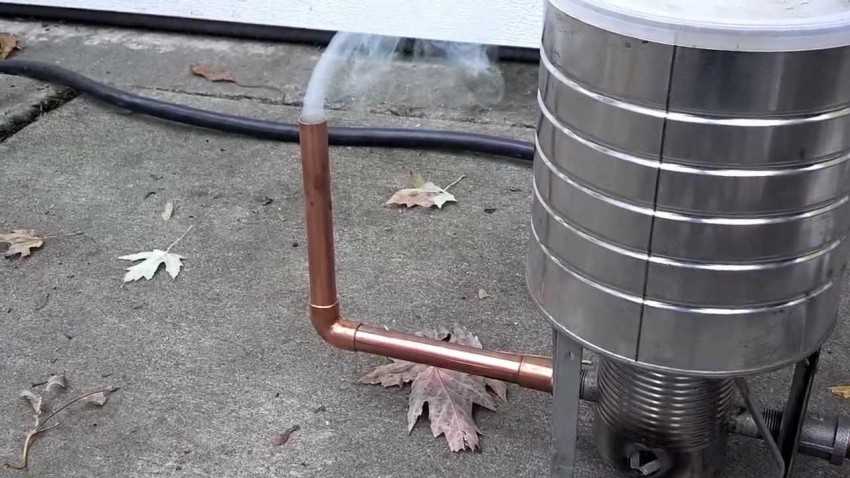 Воздух, нагнетаемый компрессором, направляет дым в дымоход, а оттуда – в резервуар с обрабатываемым продуктом.