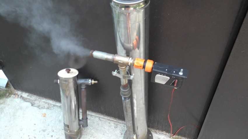Для его изготовления нередко используют водопроводные трубы из металла, в роли резьбовых, сварных соединений — сантехнические уголки, сгоны. Есть 2 варианта размещения эжектора — в верхней или нижней части дымогенератора. Предпочтительнее первый, так как: