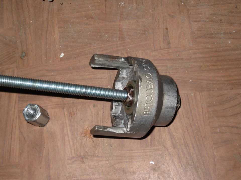 - В отсутствие специальных приспособлений используется самодельный или заводской пресс-съемник, который с помощью болта, шайб, гайки и двух наставок выдавливает деталь. Все эти компоненты должны быть прочными и надежными. Используя подобное приспособление, можно произвести выпрессовку без демонтажа ступицы и рычага.