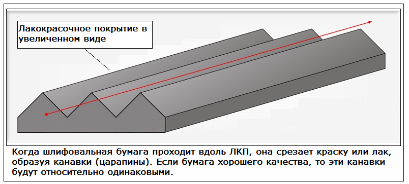 - Шлифовка производится прямыми движениями в одном направлении. Далее, после смены абразива на более мелкий или при втором проходе тем же абразивом, направление шлифования меняется на 90 градусов. Так царапины будут более равномерными и одинаковыми по глубине. К тому же, Вы сможете визуально контролировать, когда удаляться царапины от более крупного абразива. Если же шлифовать несколько проходов только в одном направлении, то некоторые царапины станут глубже, а какие-то будут менее глубокими (см. иллюстрации ниже).