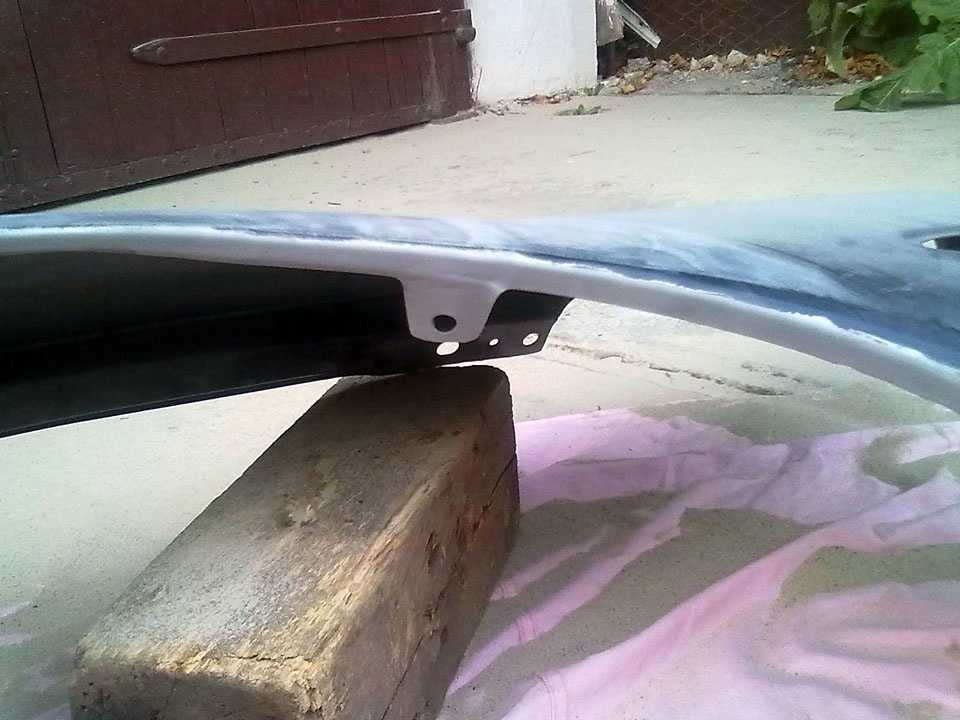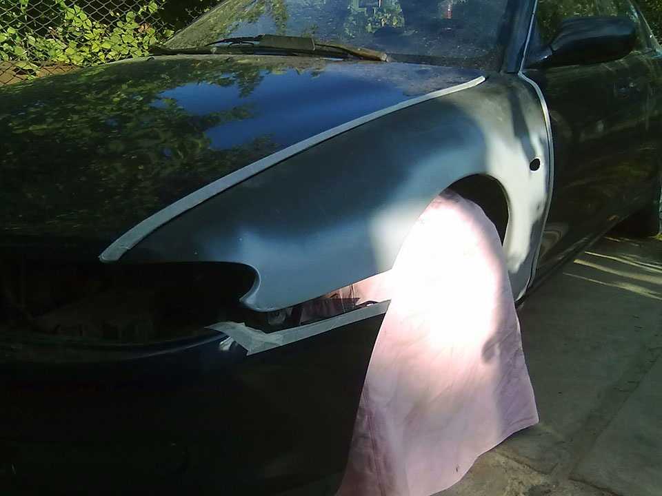 Прикрутил крыло к тачЬке, накинул розовый сарафан, обклеил торцы, укутал колёса и зачистил выравниваемое место до голого металла.