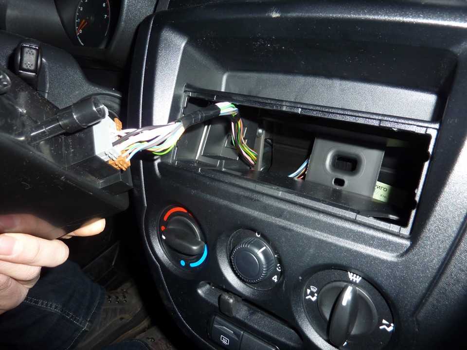 Установка магнитолы начинается с демонтажа декоративных заглушек, закрывающих посадочное гнездо в центральной консоли. Для крепления головного устройства используются металлические обоймы, которые удерживаются в панели приборов отгибаемыми усиками. Если в машине применялась магнитола 1 Din-формата, а планируется установка оборудования с увеличенными габаритами, то из консоли извлекается ящик для мелких предметов. На части машин установить проигрыватель стандарта 2 Din невозможно или для размещения узла потребуется установка новой консоли.