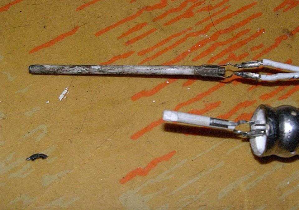 Нам нужно очень осторожно, чтобы не сломать, извлечь его нагреватель. На фото целый и ломаный: