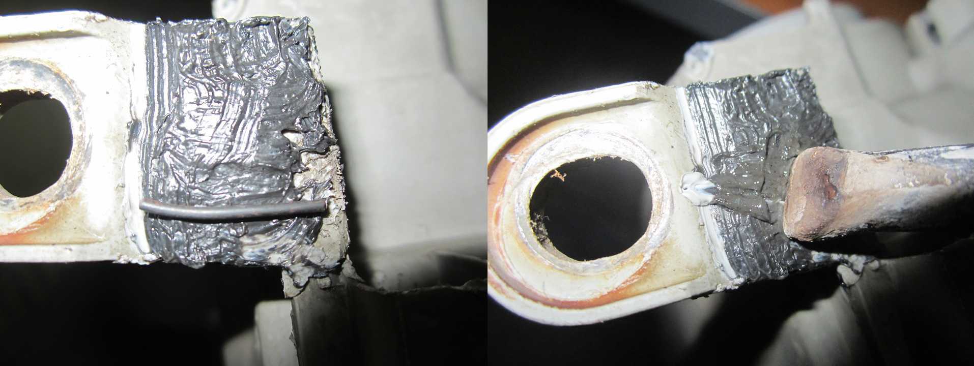 Затем отломанную часть крепежа прикладывают к фаре и паяльником делают небольшие борозды на стыке деталей.