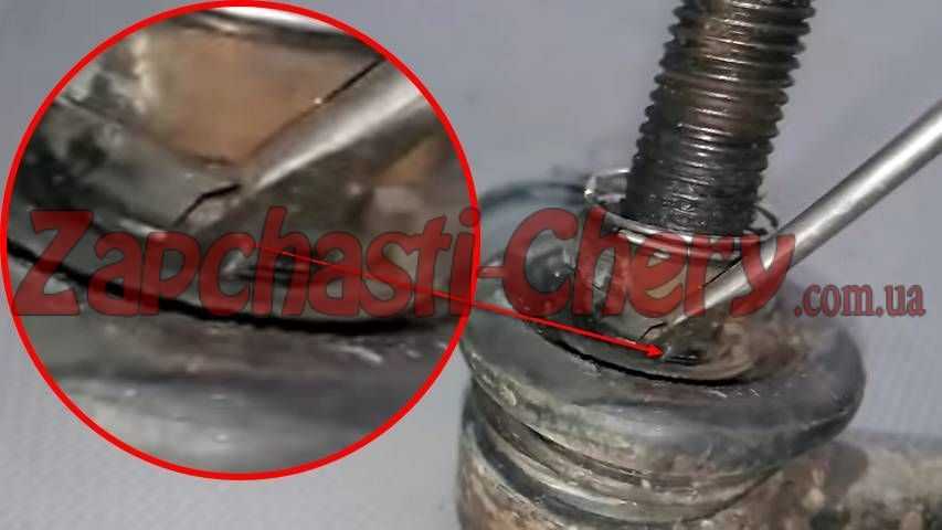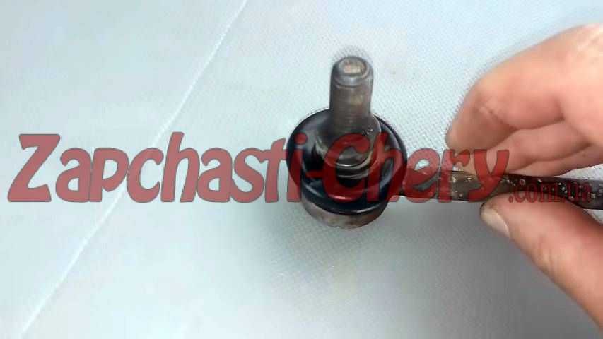 Разрыв пыльника шарнира стойки. В этом случае вода, песок и пыль проникают в шаровое сочленение и работают в качестве абразива, стирая шаровый наконечник и пластиковые втулки, которыми он обжат на заводе. После разрыва пыльника или появлении трещин на его поверхности стойка долго не протянет и застучит уже после нескольких сотен пробега, особенно в условии плохих и грунтовых дорог.