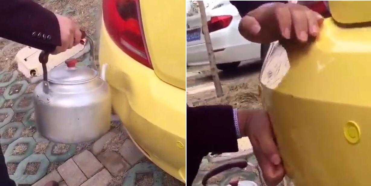 Для удаления вмятины необходимо постепенно начать выливать кипяток из чайника на повреждение.