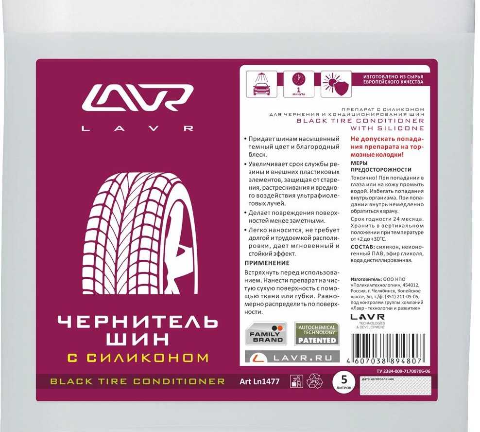 Открывает тройку лидеров в ТОП чернителей для пластиковых бамперов автомобиля еще один препарат от компании LAVR. Это силиконосодержащий чернитель, который подходит и для шин. Black Tire Conditioner with silicone возвращает резине и пластику благородный черный цвет, защищает от атмосферных явлений, в том числе от ультрафиолетовых лучей. После нанесения средства мелкие дефекты становятся практически незаметными, так как составляющие чернителя проникают глубоко в рельеф материала.