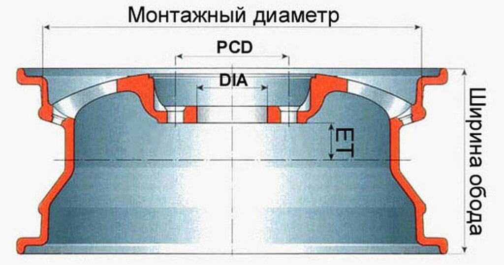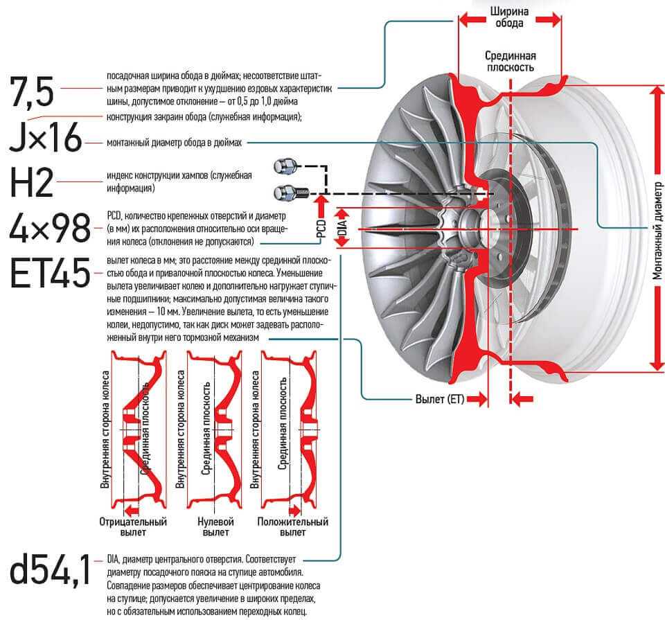 что это такое вылет диска — это расстояние от сечения крепления до центральной оси симметрии обода. В маркировке он может не указываться, но в документации автомобиля присутствует. От этого параметра зависит то, насколько нагружена подвеска;