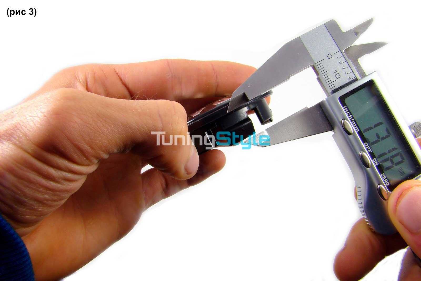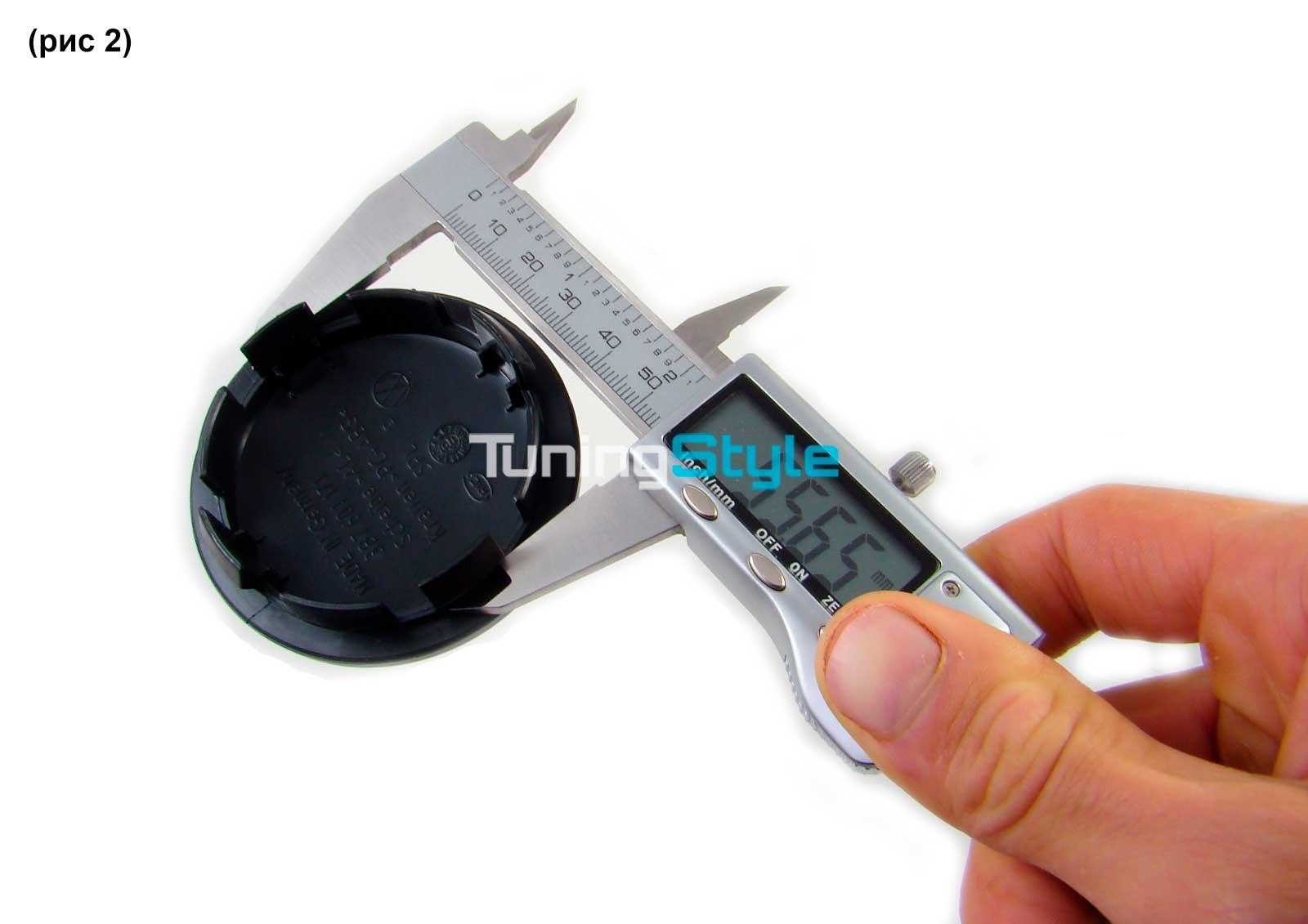 1. Внешний диаметр колпачка, он же является наружным диаметром ступичного отверстия в диске, можно измерить зажав штангенциркулем шляпку колпачка, как показано на рисунке 1.