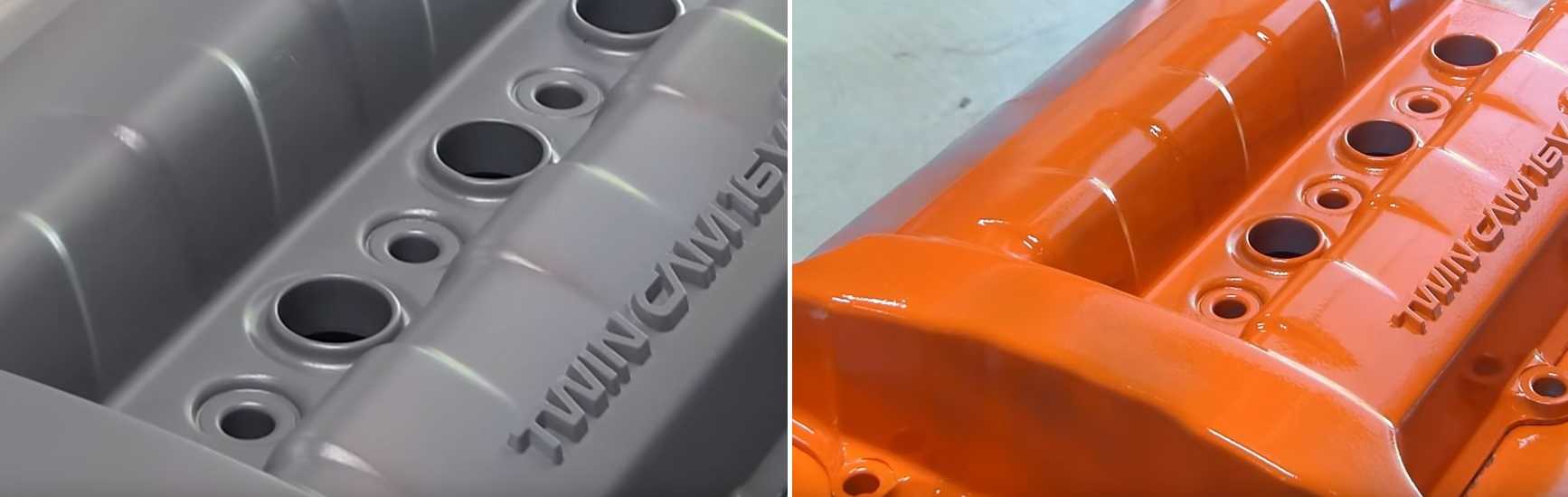 На алюминиевую клапанную крышку лучше нанести специальный эпоксидный высокотемпературный грунт (Engine Enamel Grey Primer). Это значительно увеличит адгезию последующего слоя краски, распылив 2 тонких слоя с интервалом 10–15 минут.