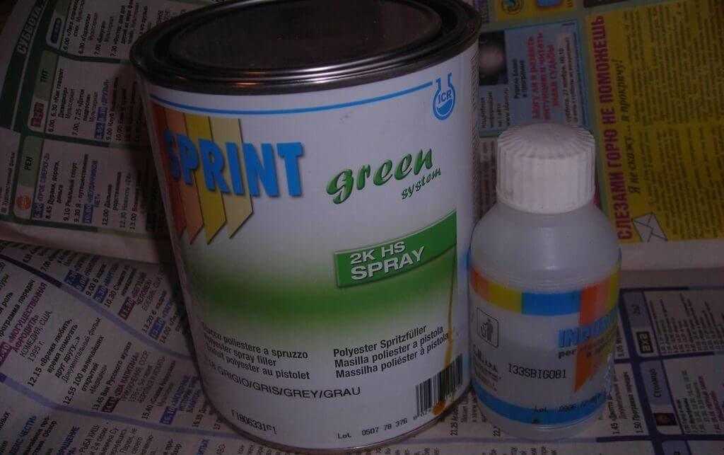 Sprint. Эта жидкая шпаклевка по металлу на основе полиэфиров достаточно быстро проходит процесс полимеризации даже при условии нанесения толстыми слоями. Помогает заполнить большие и микроскопические по размеру поры, выравнивая труднодоступные поверхности авто. Еще одно достоинство смеси — тиксотропность (отсутствие растекания при нанесении на вертикальные поверхности). Высокая эластичность обуславливает легкую шлифовку. Рекомендуется использовать эту смесь при шпатлевании большой поверхности;