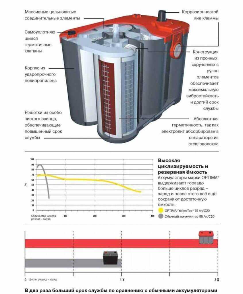 Он долговечен, стоек к длительному разряду слабым током. Даже если машина долгое время стоит в гараже, можно не опасаться, что в момент необходимости поездки обнаружится полный разряд аккумулятора. Кроме того, заряжается он быстро.