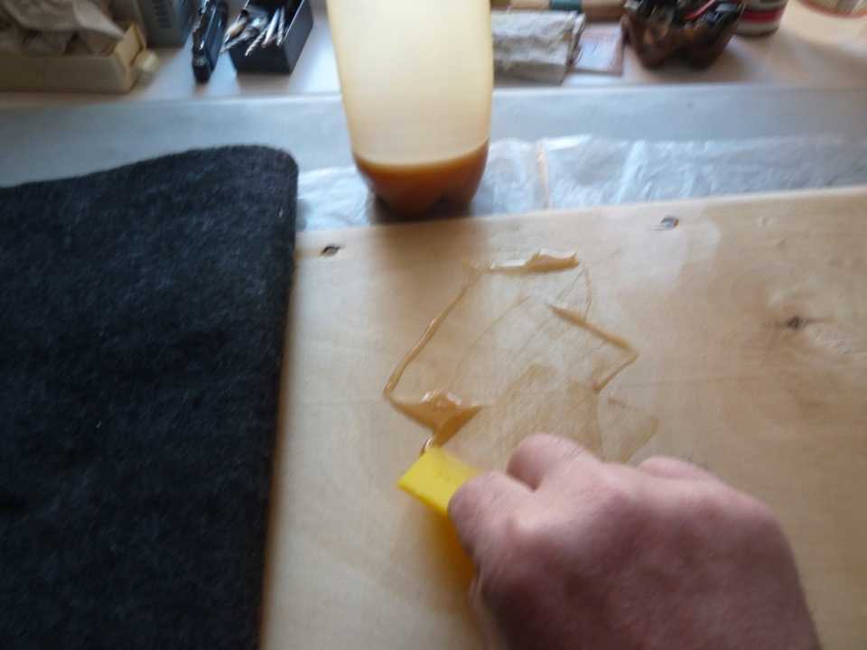 - Грунтуем всю оклеиваемую поверхность короба (промазываем равномерным тонким слоем клея 88-СА, ждем, пока клей впитается в древесину и подсохнет)