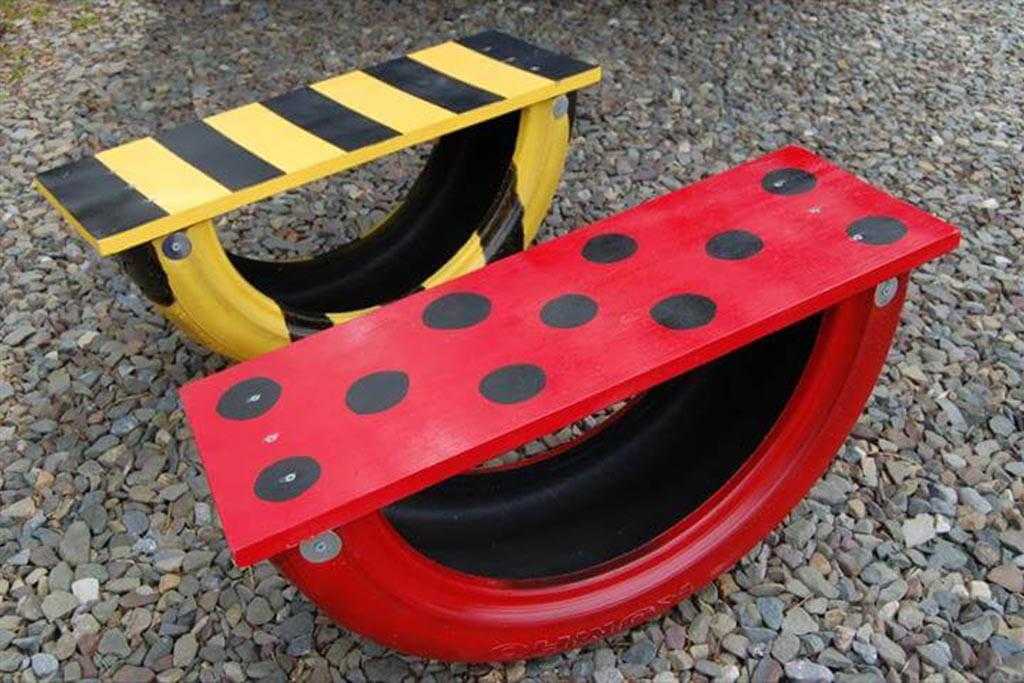 На детских площадках изготавливают из колёс покрытие, защищающее от травм малышей.