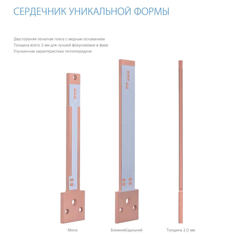 Двухсторонний сердечник дает возможность выполнить его максимально тонким (1,5-2мм), это хорошо сказывается на световом пятне и освещенности перед автомобилем