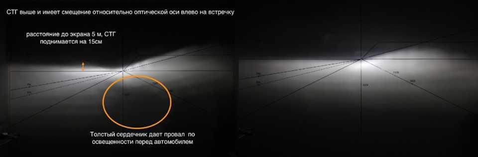 В случае если сердечник толщиной более 2 мм, то ниже оптической оси будет провал освещенности. Перед машиной будет темная область. При выборе ламп следует поинтересоваться какой толщины и из какого материала он выполнен. Если материал — алюминий, то рекомендуем отказаться от их покупки сразу, т к лампы либо быстро умрут либо будут тусклыми.