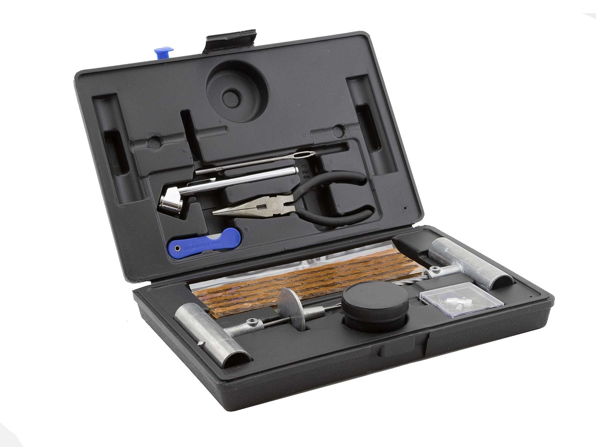 - Michelin Tire Repair Tools Kit – чтобы купить этот комплект для ремонта пробитых бескамерных шин, достаточно иметь в кармане всего 180 рублей. Комплектация оставляет желать лучшего, тем не менее, рашпиль, игла и полоски резины для ремонта есть. Клей жидковат, но отремонтировать колесо удалось.