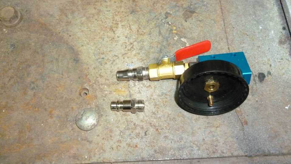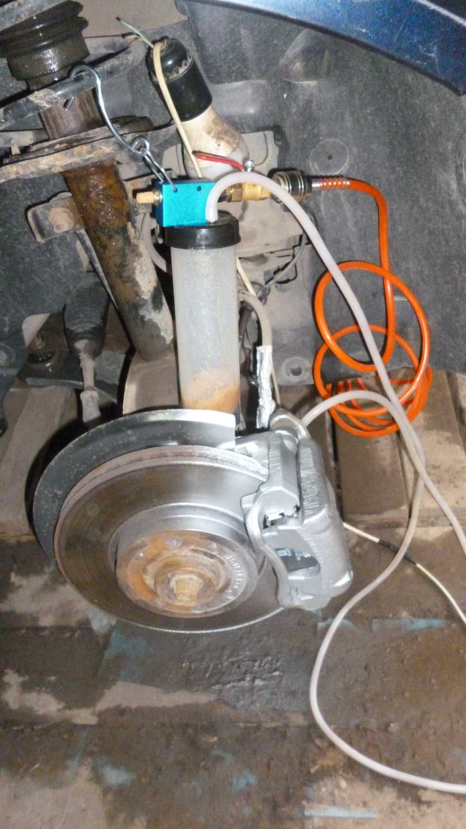 6. Затем поставил шланг на передний водительский штуцер прокачки воздуха, включил компрессор и выполнил тоже самое.