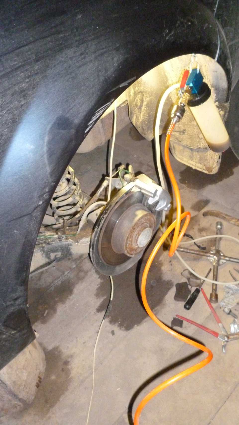 7. После поставил шланг на задний левый штуцер прокачки воздуха, включил компрессор и выполнил тоже самое.